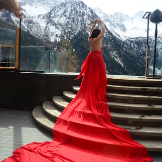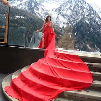 La struttura mette a disposizione degli ospiti, una serie di abiti di alta moda da noleggiare. Io ho scelto quello rosso con una coda di qualche metro.